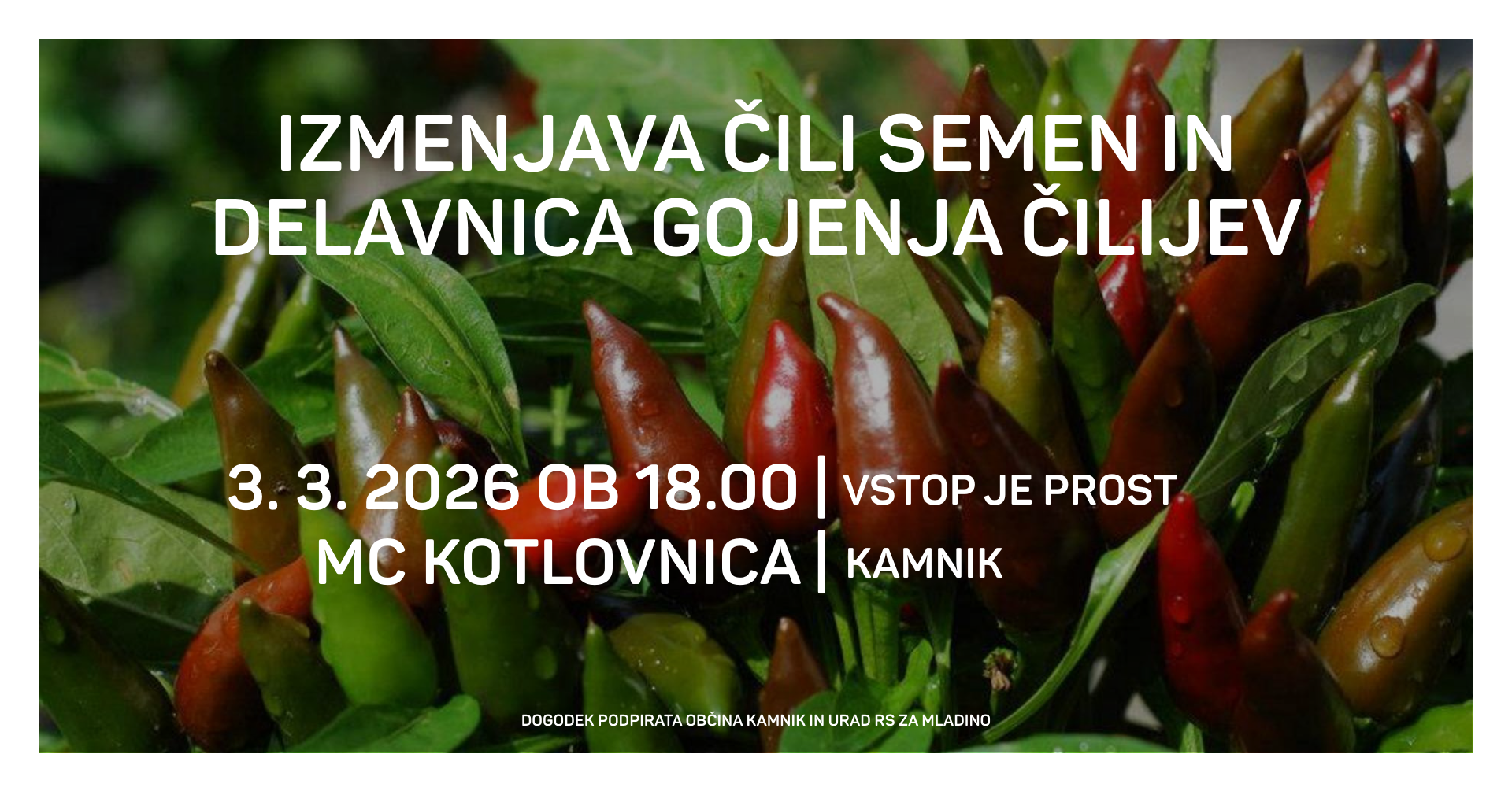Vabimo na srečanje ljubiteljev čilija, kjer bomo na začetku naredili kratek pregled gojenja čilijev: kalitev, presajanje, navajanje na zunanje temperature, presaditev v vrt, gnojenje, opraševanje, pobiranje pridelka, načini uporabe čilijev. Nato bomo poizkusili čili proizvode – domače čili omakce, olja ... in na koncu izvedli še izmenjavo semen.