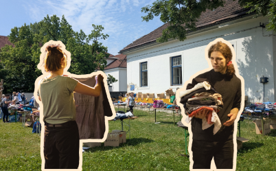 Right: ESC volunteers Lili and Benedikt during a clothing exchange, background: clothing exchange in the Creative Quarter Barutana