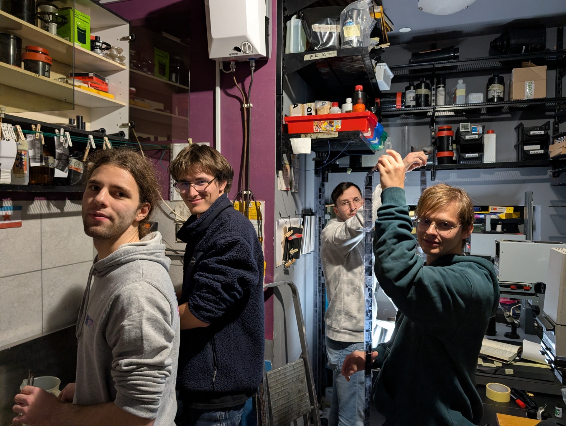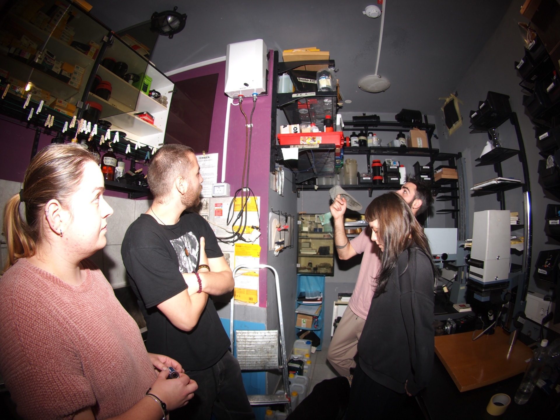 Udeleženci so se z mentorjem stisnili v temnico FKK. Ker je vsak uporabljal drugačno kamero in drugačen film, so uporabili različne pristope. Naučili so se koristiti »film retriever«, odpreti kanister »na silo«, film »rewindati« in potegniti direktno iz kamere. Nekateri so film razvijali z uporabo stroja, drugi so delali »stand development«. Kemikalije so si zmešali sami in film kuhali glede na čase, ki so jih razbrali iz Massive Dev Charta za svoj tip filma in kemikalij. Vsaj eden iz skupine je poskusil način »pushanja« filma na višji ISO za kasnejšo primerjavo. Po delavnici filme so filme lahko pustili sušiti v temnici ali so jih vzeli domov.