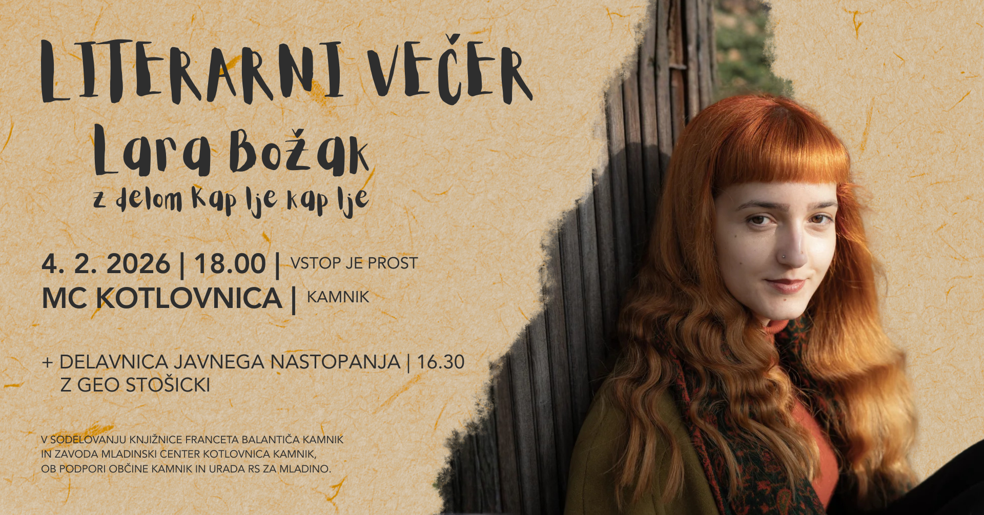 Januarski literarni veฤer se zaฤne ob 18-ih, pred njim pa bo v Kotlovnici potekala tudi brezplaฤna delavnica javnega nastopanja z Geo Stošicki med 16.30 in 17.30, ki je odprta za vse. Dogodek se bo ob 18-ih zaฤel s kratkim open-mic-om: poleg udeleลพenk in udeleลพencev kroลพka lahko na delavnici in na uvodnem branju sodelujete tudi tisti, ki ne obiskujete kroลพka!