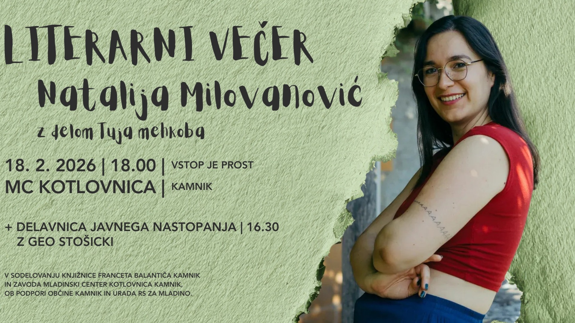 Februarski literarni večer se začne ob 18-ih, pred njim pa bo v Kotlovnici potekala tudi brezplačna delavnica javnega nastopanja z Geo Stošicki med 16.30 in 17.30, ki je odprta za vse. Dogodek se bo ob 18-ih začel s kratkim open-mic-om: poleg udeleženk in udeležencev krožka lahko na delavnici in na uvodnem branju sodelujete tudi tisti, ki ne obiskujete krožka!